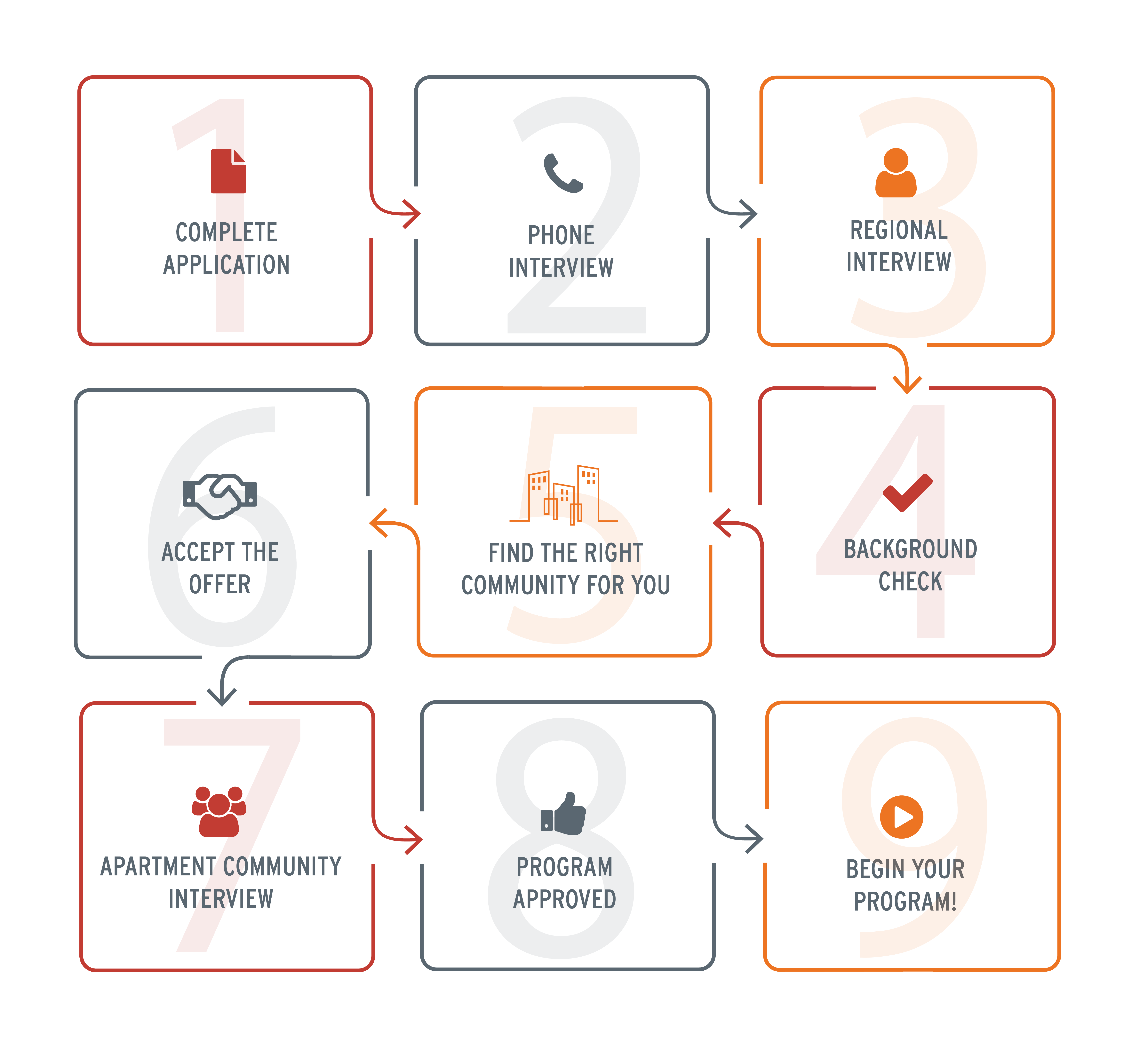 We value your time and commit to making the application process work as quickly as possible. After you are approved to serve as a coordinator, the placement process is much less predictable, and the timing depends on what open apartment communities we have near you, as well as your current living situation. Once you make it to the placement process, our specialists will be diligent to communicate with you regularly with status updates.