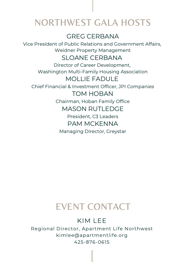We hope you will join us for an evening of networking, sharing, celebrating, and giving. Our emcee will be Tom Hoban and our special guest speaker will be Pete Kelly, CEO of Apartment Life.